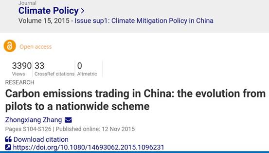 全文(1.22万字)刊登在2015年出版的Climate Policy第15卷,被经济学、法学、政治科学、公共管理和环境研究等SSCI五大学科一区期刊和SCI一区期刊文章引用,在出版社网页有3300多次阅读。中国承诺计划2017年启动全国碳排放交易体系当日的《纽约时报》评论和《科学美国人》等覆盖面大、受众多的综合媒体引用了本文的观点。
