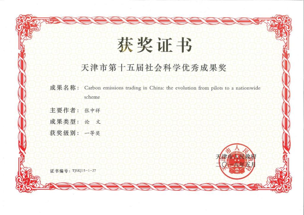 天津大学卓越教授、马寅初经济学院院长,国家能源、环境和产业经济研究院院长张中祥教授2015年发表在Climate Policy期刊上的文章“Carbon Emissions Trading in China: The Evolution from Pilots to a Nationwide Scheme”(中国碳排放交易:从地区试点向全国体系演变)荣获天津市第十五届社会科学优秀成果一等奖。该文被经济学、法学、政治科学、公共管理和环境研究等SSCI五大学科一区期刊和SCI一区期刊文章引用,在出版社网页有3300多次阅读。中国承诺计划2017年启动全国碳排放交易体系当日的《纽约时报》评论和《科学美国人》等覆盖面大、受众多的综合媒体也引用了该文的观点。在耶鲁大学等欧美澳大学和机构应邀围绕该文做过1-2小时专场报告,在墨西哥前总统Ernesto Zedillo教授和诺贝尔经济学奖得主Jean Tirole教授组织的会议上也报告过该文的主要内容。