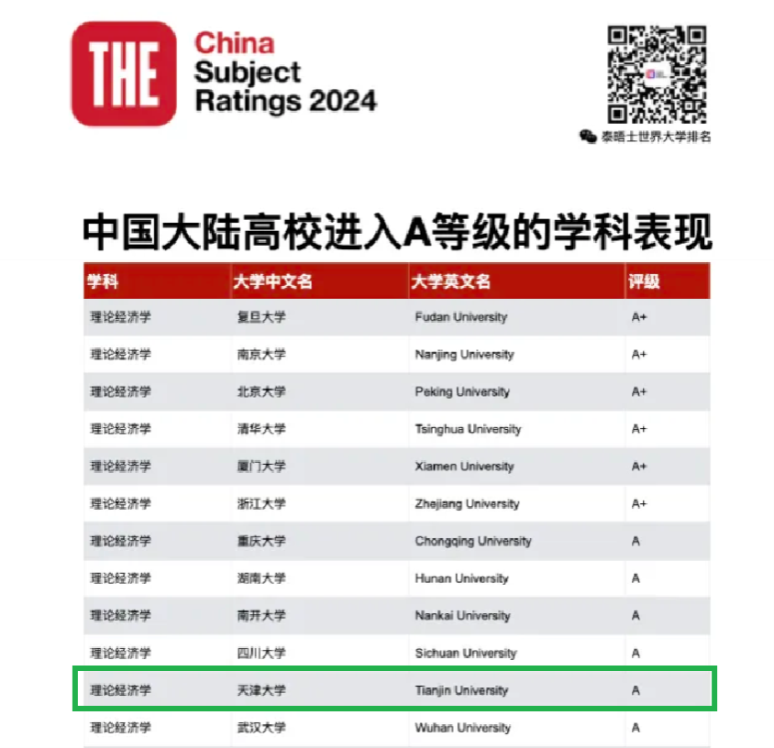 2024年3月27日,泰晤士高等教育(Times Higher Education,简称THE)发布了2024年泰晤士高等教育中国学科评级,中国大陆12所高校理论经济学学科获得A+和A评级,天津大学理论经济学学科位列其中!