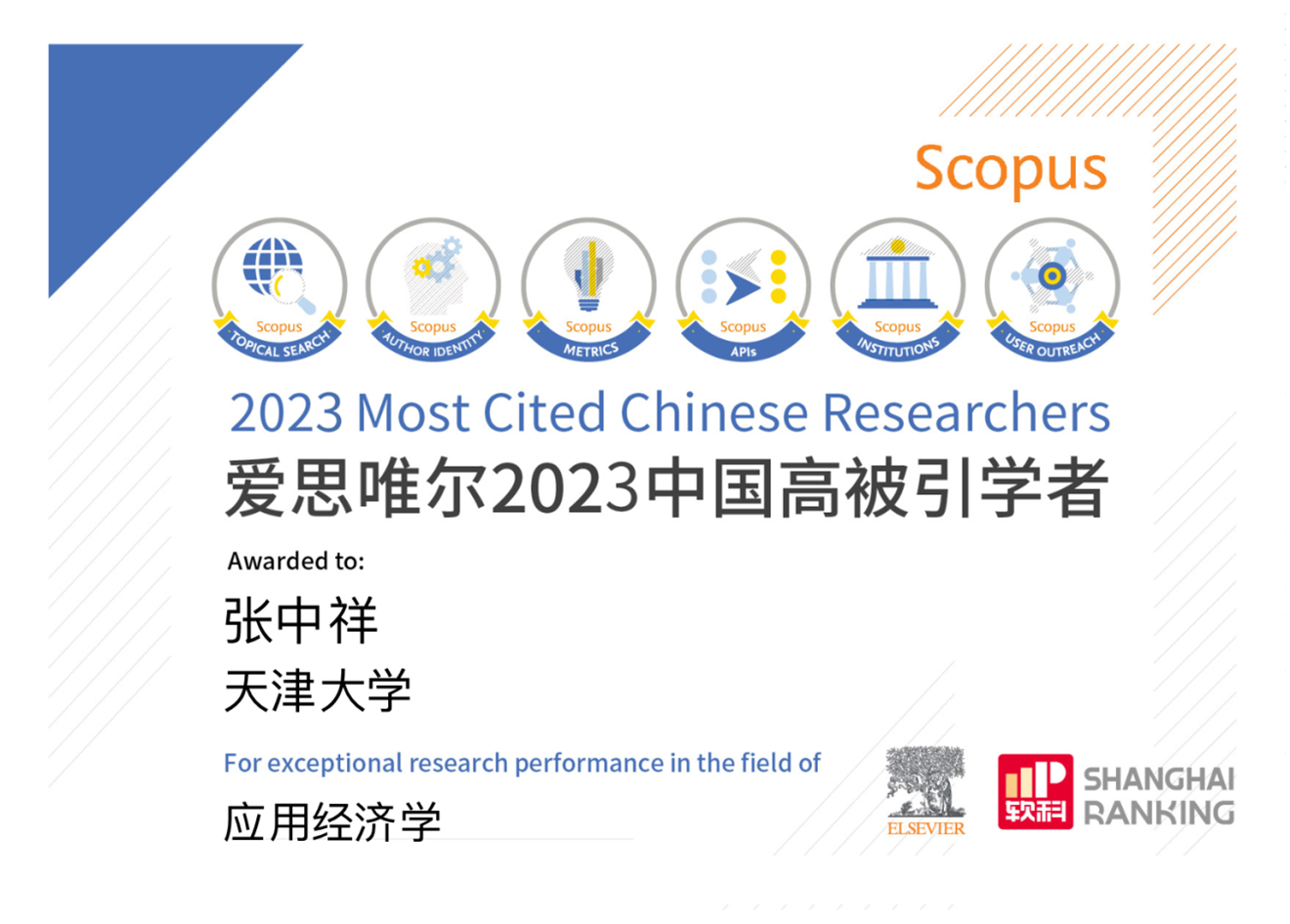 2024年3月27日,爱思唯尔(Elsevier)发布了2023“中国高被引学者”(Highly Cited Chinese Researchers)榜单。张中祥自该榜单发布以来连续十年入选经管领域“中国高被引学者”榜单。
