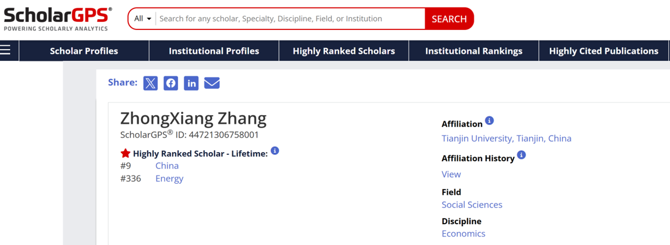 在ScholarGPS评估体系中,张中祥归类为社会科学领域、经济学学科。