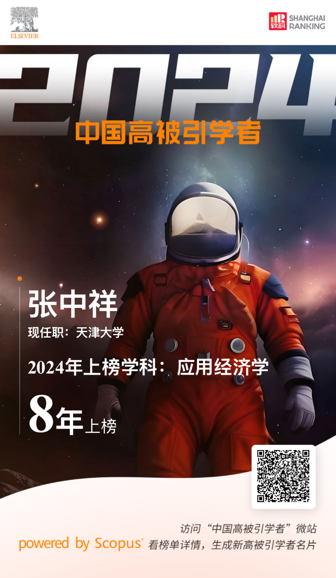 2025年3月25日,爱思唯尔(Elsevier)发布了2024度“中国高被引学者”(Highly Cited Chinese Researchers)榜单。马寅初经济学院创院院长张中祥入选应用经济学科“中国高被引学者”榜单,这是自该榜单发布以来张中祥连续11年入选经管领域“中国高被引学者”榜单,其中8次入选经济学科榜单,3次入选管理科学与工程学科榜单。