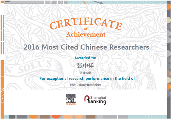 2015-2020年张中祥曾连续六年入选“经济、经济计量学与金融”领域“中国高被引学者”榜单,连续位列该榜单前4位,该领域每年有15-22名学者上榜。2021年发布的榜单首次因为入选者所在学校的学科与教育部的学科对接,张中祥被调整到管理科学与工程学科,连续三次入选管理科学与工程领域“中国高被引学者”榜单。2024之后,又调整回经济学科。