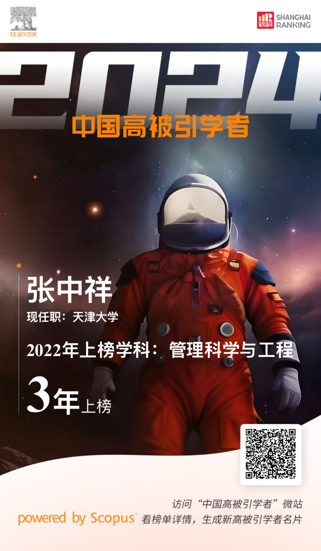 据悉,爱思唯尔“中国高被引学者”榜单2015年首发。该榜单以全球权威的引文与索引数据库Scopus作为中国学者科研成果的统计来源,采用上海软科设计的遴选方法,从多个维度深度剖析、识别处于科研职业生涯不同时期的中国学者的科研成果表现,最终得出各学科最具全球影响力的中国学者名单。这里中国学者指署名机构为中国(大陆)机构的作者、且现职工作单位在中国,包括非中国籍和非华裔学者。