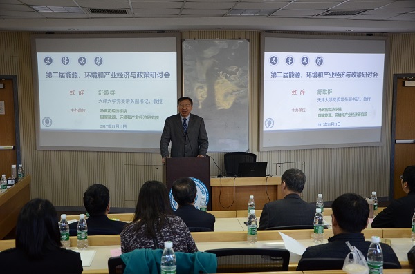 会议组织者,天津大学卓越教授、马寅初经济学院院长,国家能源、环境和产业经济研究院院长张中祥博士主持致辞和全天的研讨会。他首先邀请天津大学党委常务副书记、973首席科学家舒歌群教授致辞。舒教授代表天津大学向出席会议的各位发言嘉宾及参会人员表示热烈的欢迎,简要介绍了天津大学的历史和学校在能源领域主要工作和取得的成就,高度评价本次研讨会把能源、环境和产业经济纳入整体来进行研究和讨论的意义和重要性,并预祝研讨会圆满成功。