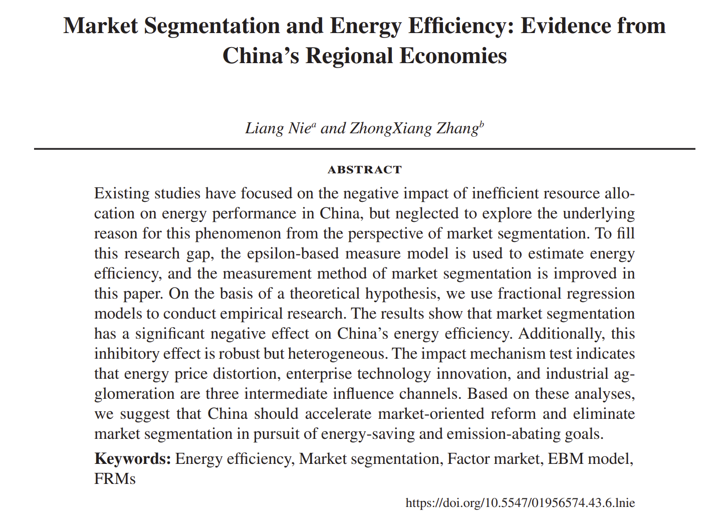 天津大学马寅初经济学院卓越教授张中祥院长与其指导的博士生聂亮合作的论文“市场分割与能源效率:来自中国区域层面的证据”(Market segmentation and energy efficiency: Evidence from China's regional economies)近期被国际能源经济学会旗舰刊物The Energy Journal录用,将刊登在今年底出版的第43卷、第6期,217-241页。