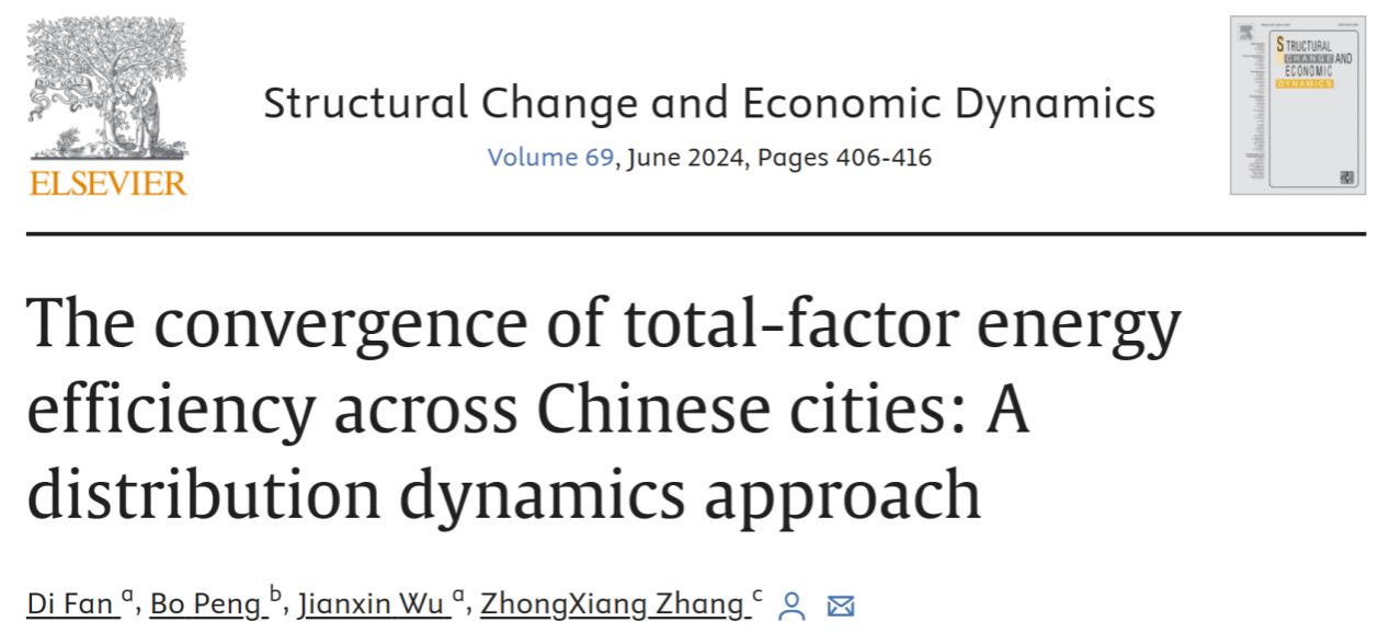 暨南大学经济学院吴建新教授团队与天津大学卓越教授、马寅初经济学院创院院长,国家能源、环境和产业经济研究院院长张中祥合作的文章“The Convergence of Total-Factor Energy Efficiency across Chinese Cities: A Distribution Dynamics Approach”(中国城市全要素能源效率的趋同:基于分布动态方法)在Elsevier出版社出版的SSCI经济类一区期刊Structural Change and Economic Dynamics《结构变迁与经济动态》正式发表,收录在该刊2024年6月出版的卷69,406-416页。