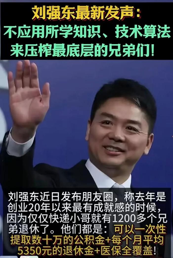刘强东发布朋友圈称,去年是创业20年以来最有成就感的时候,因为仅仅快递小哥就有1200多个兄弟退休了。他说:“我们所学的知识、商业模式、技术算法都不应该是用来压榨社会最底层的兄弟们的!我们的利润、市值和财富更不应该建立在底层百姓无保障的生活之上的!”。