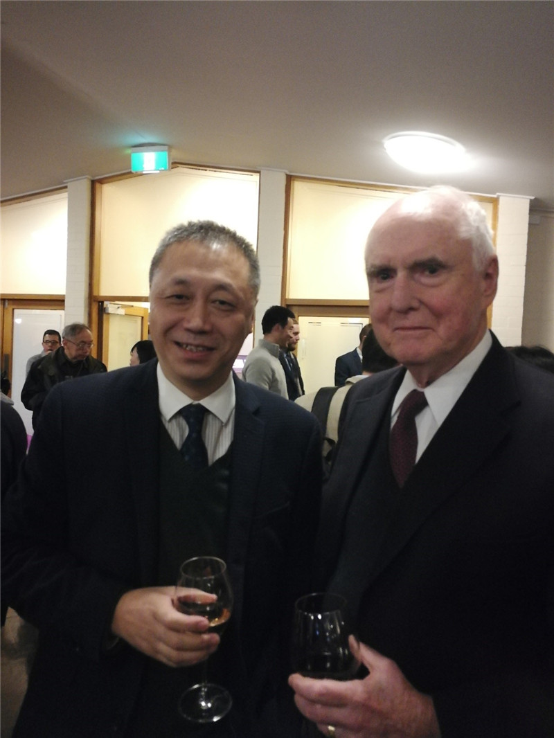 2018年7月19日晚上,举行了Ross Garnaut教授、宋立刚教授和中国社会科学院蔡昉副院长主编的2018年中国经济前沿丛书《回溯40年中国改革和发展:1978-2018》发行仪式。新书收录了来自中美澳三国和国际机构研究中国经济问题的经济学者应邀撰写的31章节。按惯例,发行仪式上会安排一位作者代表发言。今年由央行货币政策委员会委员、国民经济研究所所长樊纲教授围绕中美贸易战做了发言。中国驻澳大利亚大使成竞业出席新书发布会并致辞。