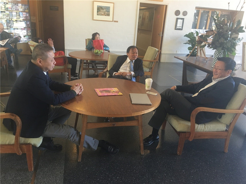 (樊纲、胡必亮和张中祥三位昔日中国社会科学院经济片的教授进行交流)