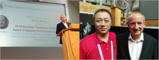 上午欧洲环境和资源经济学家学会终身成就奖(政策实践)得主、欧盟委员会气候司Delbeke司长在张中祥教授组织的政策分会上发言后,原联合国气候变化公约秘书处执行秘书Yvode Boer被授予终身成就奖(政策实践)。当年Yvo在荷兰政府任司长时,支持了90年代在荷兰瓦赫宁根大学和格罗宁根大学任职的张中祥教授8年的研究工作以及张中祥教授任职美国东西方中心时组织的活动。感谢当年的博士生、现任荷兰Tilburg大学经济系教授的Daan van Soest帮拍了张合影。