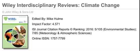 据Wiley Interdisciplinary Reviews: Climate Change网站介绍,2016年该期刊因子为4.571,位列SSCI环境研究类下105期刊第五位。该刊仅发表应编辑邀请撰写的文章。我的这篇文章就是应斯德哥尔摩大学政治学教授Karin Bäckstrand邀请撰写的。
