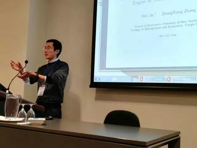 本次年会以“中国新常态经济增长:机遇与挑战”(China’s“New Normal”Growth: Opportunities and Challenges)为主题,安排了2场主旨演讲和31场平行分会。北京大学国家发展研究院姚洋院长、加州大学戴维斯分校经济学教授胡永泰、亚洲开发银行首席经济学家顾问Jesus Felipe博士、北京大学国家发展研究院张晓波教授和澳大利亚科廷大学Dora Marinova教授也分别做了大会主旨报告。在可持续发展分会场,澳大利亚新南威尔士大学商学院大学校长博士后研究员(Vice-Chancellor’s Postdoctoral Research Fellow)靳玮博士报告了与张中祥教授合作的依据内生技术进步增长模型展示中国从投资驱动导致不可持续发展向创新引领发展转型的一篇理论文章(China’s Pursuit of Environmentally Sustainable Development: Harnessing the New Engine of Technological Innovation)。