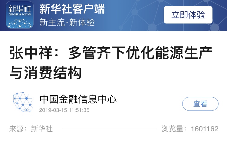 2019年3月15日新华社客户端推送的天津大学马寅初经济学院院长、卓越教授张中祥的文章“多管齐下优化能源生产与消费结构”,新华社客户端网站显示的阅读量已超过160万。