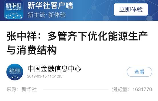 2019年3月15日新华社客户端推送的天津大学马寅初经济学院院长、卓越教授, 国家能源、环境和产业经济研究院院长张中祥的文章“多管齐下优化能源生产与消费结构”,新华社客户端网站显示阅读量已超过163万。该文是应邀为人民日报社主管的《国家治理》周刊撰写的。