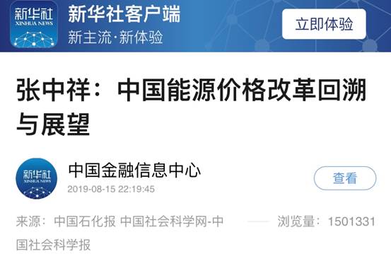 2019年8月15日新华社客户端推送的张中祥的文章“中国能源价格改革回溯与展望”,新华社客户端网站显示阅读量已超过150万。该文是应邀为《中国社会科学报》经济学版撰写的。