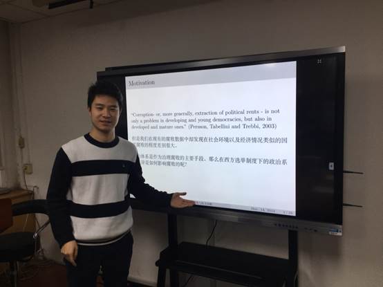 王一智在政治经济学分论坛报告了论文《选举制度以及有效政党数量对腐败的影响》。他研究了政治系统中的权利分配平均程度对腐败的影响。王一智指出这篇文章主要着眼于有效的政党数量以及选举制度中的平均性这两项指标来衡量权利分配的平均程度。王一智和他的合作者发现选举制度的平均性越低,腐败的被约束的越好。这是因为权利分配的平均也会使得责任分配的平均或者责任分配不清晰,从而导致了选民无法有效约束政党。另一方面,增加有效政党数量对于腐败有两种作用:一是加强竞争的效果;二是分裂选民的效果。当后者强于前者时,增加有效政党数量带来更多的腐败。王一智和他的合作者通过对超过90个国家的数据进行实证分析,数据中也显示出有效政党数量和选举制度平均性对腐败有着显著的影响,其结果也和理论相符。