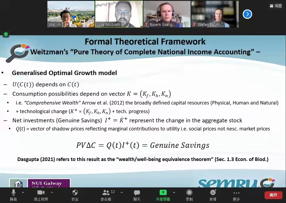 天津大学马寅初经济学院副教授靳玮博士在“Sustainable development”分会场报告了其与合作者英国牛津大学Rick van der Ploeg教授和香港城市大学张林博士的论文《绿色经济转型是否还需要碳密集型资产?》。靳玮指出,数据显示加强环境规制会引导清洁型资产积累,而后者又将反哺污染型资产积累,而非必然导致污染型资产搁浅和产能削减。根据这一特征化事实,本研究构建了一个两部门绿色经济增长模型,分析清洁型与污染型两种不同资产相互作用并影响绿色经济增长的机制。模型结构聚焦于两种资产相互作用的三种可能途径:通过环境质量渠道,清洁型资产直接减少污染型资产积累造成的污染物排放和效用损失;通过最终产品生产渠道,清洁型资产积累将减缓污染型资产侵蚀和折旧,增加污染型资产的边际生产率;通过投资品分配渠道,清洁型资产将与污染型资产在投资品分配上产生竞争,市场均衡情况下的投资品分配取决于两种不同资产的影子价值。理论分析结果如下。首先,清洁和污染型资产相互作用可以产生互惠效应,促进两种类型的资产同时积累。即清洁型资产积累将增加污染型资产的边际生产效率,保护其经济价值,促进其积累而非资产搁浅。随着污染型资产边际生产效率的提升,市场将供应更多最终产品并用于清洁型资产投资。其次,上述资产互惠机制能促进中短期的资产积累,但是长期将收敛于稳定状态,无法实现内生持续增长。本研究进而提出一种清洁和污染型资产相互作用下的内生增长机制。结果显示:如果个体的效用偏好在消费和环境之间具有单一替代弹性(即消费与污染的边际替代率与数量比成正比例关系),同时分配最终产品用于清洁资产投资没有调整成本,那么经济体将转型进入平衡内生增长路径。沿着这一路径,消费内生增长,清洁和污染型资产持续积累,同时污染排放将不断减少。