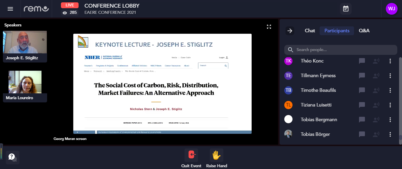2021年6月23日至6月25日,由欧洲环境与资源经济学家协会主办,柏林工业大学和柏林洪堡大学承办的2021年第26届欧洲环境与资源经济学家协会年会取得圆满成功。作为本年度环境与资源经济学领域的重要国际学术会议之一,大会吸引了全球众多环境与资源经济领域学者注册参会。会上6位嘉宾先后发表了主旨演讲,包括2000年诺贝尔经济学奖得主、哥伦比亚大学教授Joseph E. Stiglitz,博科尼大学教授Valentina Bosetti,苏黎世大学教授Stefano Battiston,巴黎第九大学教授Birère, Marie,哥伦比亚大学教授Heal, Geoffrey,图卢兹管理学院教授Moinas, Sophie。本次会议就碳减排,环境规制,绿色创新,气候变化,低碳转型,绿色增长,可持续发展等领域的不同议题分百余个平行分会场交流分享,讨论气氛热烈,嘉宾交流充分。