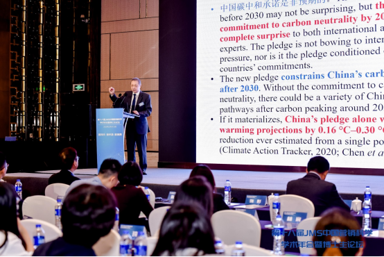 张中祥的发言以“双碳目标、碳市场、碳边境调节机制及对市场营销的挑战”为题。他指出,中国的碳中和承诺是非预期的,但对实现全球温控目标至关重要。他强调,实现碳中和目标需要中国把温室气体排放总量降到比较低的水平,这是碳中和的主攻方向。中国政府制定了“1+N”政策体系和实施方案,涵盖生产端(控煤炭煤电、发展风光发电等)、使用端(新能源汽车、充电桩等)、政策端(绿色金融、全国碳市场建设等)。他强调,欧盟碳边境调节机制有不少引起争议的地方,将增加中国高碳企业的出口成本,影响产品竞争力。中国主动承诺和外部一些压力会加快中国经济和能源结构深度调整,持续推进全国碳市场建设。最后,以中国芯片/制造企业如何打造全流程绿色产业链,实现碳链全过程的减碳为例,张中祥指出了双碳战略对市场营销的新挑战。