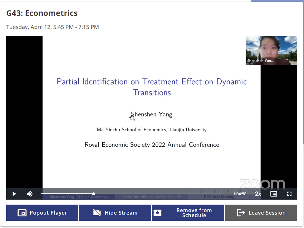 天津大学马寅初经济学院助理教授杨珅珅在 “G43: Econometrics”分会场报告了其工作论文“Partial Identification on Treatment Effect on Dynamic Transitions”。该工作论文提出了在动态转化过程中处理效应的部分识别方法。在动态环境下,即使进行实验随机性假设,动态选择问题仍然会造成内生性并且阻碍模型识别。该研究针对于动态内生性,对文献中已有方法进行了改进,利用了数据中容易被忽略的信息,在首期实验随机性假设下,得出了未来每期的处理组幸存者平均处理效应的最窄解析区间。同时,论文提出在随机假设不满足的情况下,通过对于当期转换率和反事实历史转换状态的一定假设,仍可以得出解析解。该方法应用于美国儿童和青年纵向调查数据,对本科毕业生毕业后10年内每年的教育回报率进行了部分识别和回归,发现十年间教育回报率区间下限保持平稳,上限在总体平稳趋势下缓慢下降。该平稳结果提供了部分证据,证明人力资源积累为正向教育回报的主要原因,信号效应起到的作用较小。