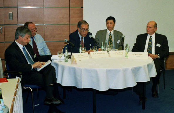 (2002年11月15日,时任美国东西方中心资深研究员的张中祥博士与美国总统特别代表Harlan Watson博士、德国联邦环境部司长Hendrik Vygen博士、巴西科技部国务秘书Luiz Gylvan Meira-Filho博士等在柏林参加圆桌讨论)