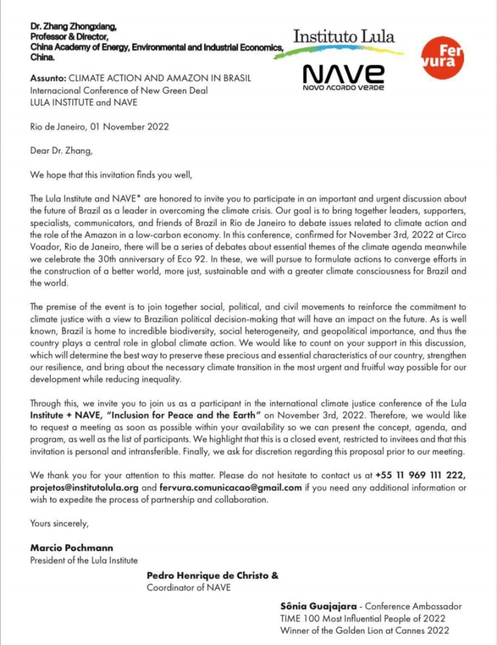 巴西卢拉学会在北京时间2022年11月3日在里约热内卢主办气候正义国际会议。这是卢拉再次当选巴西总统后、卢拉学会主办的首场重要活动。会议聚焦气候正义,讨论巴西在今后应对全球气候变化危机中的领导作用。应中国政府有关部门和中国驻巴西大使馆推荐,应卢拉学会会长Marcio Pochmann邀请,天津大学马寅初经济学院创院院长、卓越教授,国家能源、环境和产业经济研究院院长张中祥围绕主题应邀作了发言, 中国驻巴西大使馆和卢拉学会对张中祥院长的发言给予了高度肯定。
