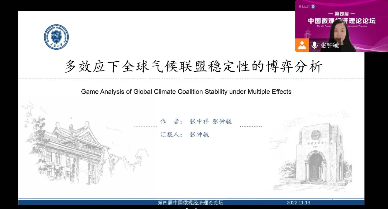 天津财经大学金融学院教师、天津大学马寅初经济学院创院院长张中祥教授指导的博士毕业生张钟毓与导师合作的论文《多效应下全球气候联盟稳定性的博弈分析》经盲审入选论坛论文,并在分论坛上做了汇报和讨论。