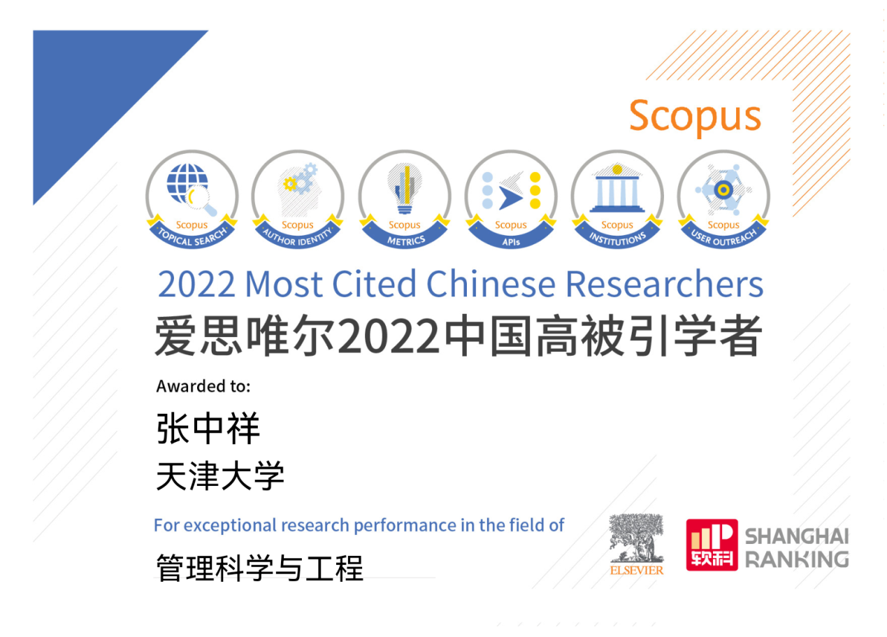 2023年3月28日,全球性信息分析公司爱思唯尔(Elsevier)正式发布了2022“中国高被引学者”(Highly Cited Chinese Researchers)榜单。天津大学马寅初经济学院创院院长、卓越教授,国家能源、环境和产业经济研究院院长张中祥自该榜单发布以来连续九年入选经管领域“中国高被引学者”榜单。