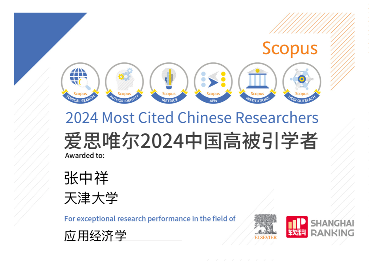 2025年3月25日,爱思唯尔(Elsevier)发布了2024度“中国高被引学者”(Highly Cited Chinese Researchers)榜单。马寅初经济学院创院院长张中祥入选应用经济学科“中国高被引学者”榜单,这是自该榜单发布以来张中祥连续11年入选经管领域“中国高被引学者”榜单,其中8次入选经济学科榜单,3次入选管理科学与工程学科榜单。