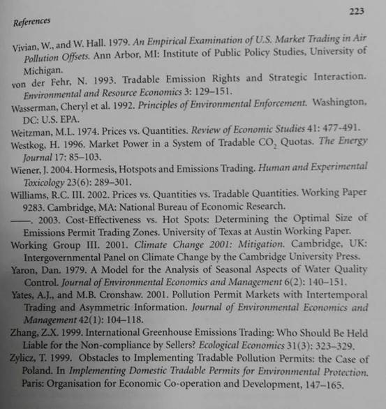 教科书引用文献非常挑剔,引用的基本上都是经典、有原创贡献的文章。在环境与资源经济学领域,教科书引用的文献除了经济学顶级期刊外,领域里的文章来自JEEM和Resource and Energy Economics(期刊发表的文章被教科书引用也是衡量期刊影响力的指标之一)居多。这本2006年由美国未来资源研究所出版的教科书引用了自己1999年发表在SSCI经济学科前10%国际期刊Ecological Economics上有关谁为国际温室气体排放交易下配额卖方不履约负责的文章。希望了解排放交易作为有效环境经济政策手段或有意从事排放交易研究的学生和学者会把这本教科书作为有益的入门读物和参考书,但之后(除非特别专业人士)还有多少能记起一些概念和研究发现的最初作者和原始出处?