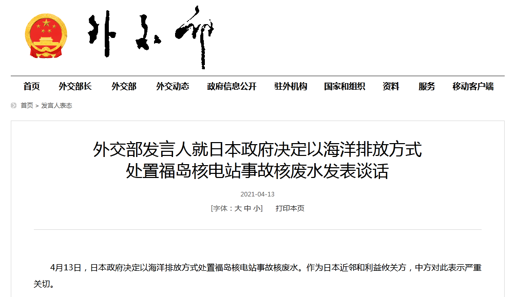 2021年4月13日,日本政府决定以海洋排放方式处置福岛核电站事故核废水。中国外交部回应,作为日本近邻和利益攸关方,中方对此表示严重关切。