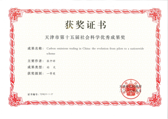 2015年张中祥发表的“Carbon Emissions Trading in China: The Evolution from Pilots to a Nationwide Scheme”(中国碳排放交易:从地区试点向全国体系演变)的文章入选位居SSCI公共管理类期刊首位的Climate Policy办刊20年20篇优秀文章“Top 20 papers for 20 years”,之前该文也荣获两年一次的天津市社会科学优秀成果一等奖。