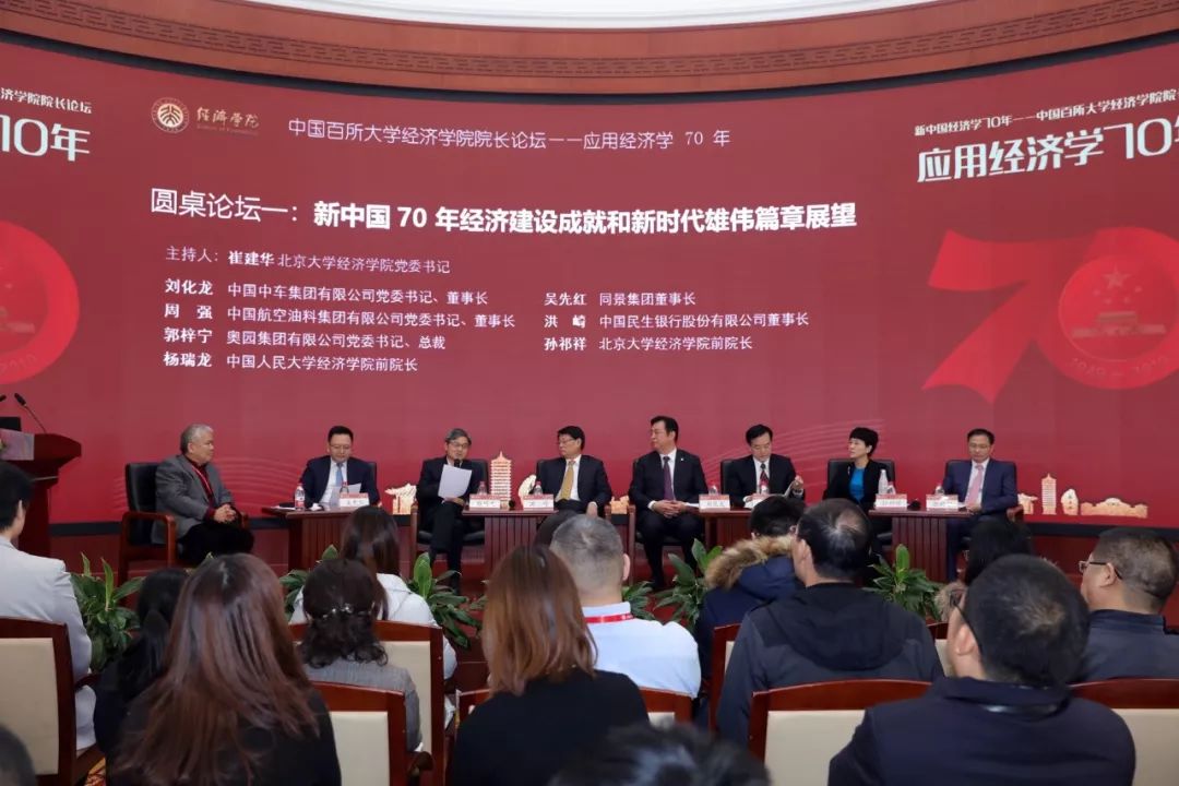 “新中国70年经济建设成就和新时代雄伟篇章展望”圆桌论坛由北京大学经济学院党委书记崔建华主持。中国中车集团有限公司党委书记、董事长刘化龙,中国航空油料集团有限公司党委书记、董事长周强,中国民生银行股份有限公司董事长洪崎,北京大学经济学院前院长孙祁祥,中国人民大学经济学院前院长杨瑞龙,奥园集团有限公司党委书记、总裁郭梓宁,同景集团董事长吴先红等嘉宾围绕各自所处的行业和实践经验就中国经济增长前景、如何稳定经济增长态势、经济深化改革、企业改革以及营商环境等主题进行了讨论和交流。