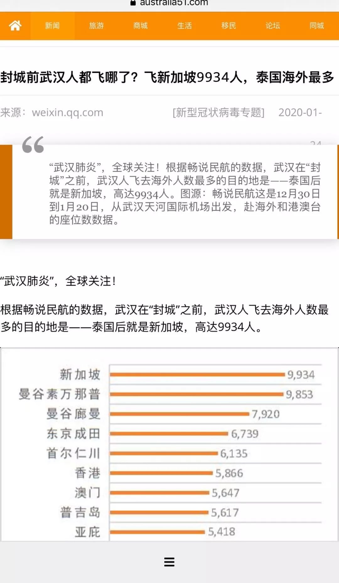 有未经证实的网络信息称,武汉封城前,武汉飞去海外人数最多的目的地是泰国和新加坡。