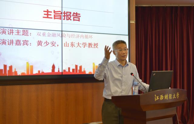 国家级领军人才、山东大学经济研究院院长黄少安教授作了“双重金融风险与经济内循环”的主旨报告。黄教授结合国际国内经济发展形势,从GDP、失业率、CPI等宏观经济指标方面对国内宏观经济发展进行了全面分析。黄教授认为目前金融风险的原因可以分解为外生周期下行趋势和外部冲击两方面,其根本问题在于我国金融系统转化和消除风险的能力还有待加强。最后黄教授从强链、延链、去链、补链、护链和联链六大方面提出实现我国产业链从中低端向高端攀升的举措。