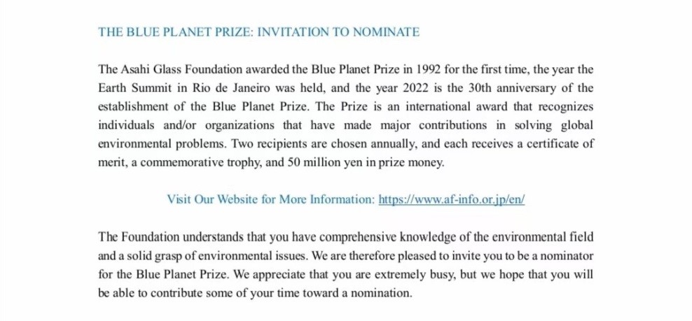 蓝色星球奖由日本Asahi Glass基金会发起和赞助,于地球高峰会议(Earth Summit)举办的1992年首次颁发。该奖项每年授予两位为解决全球环境问题有重大贡献的个人或组织,每位获奖者将获得5000万日元的奖金。