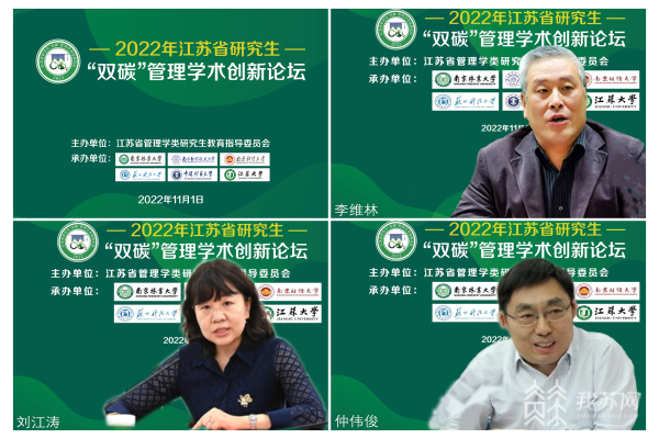 江苏省教育厅研究生教育处副处长刘江涛、江苏省管理类研究生教育指导委员会主任委员仲伟俊先后代表主办单位致辞。党中央对我国碳达峰、碳中和的最新战略部署,彰显中国在“双碳”目标上更加坚定、更加自信。国家“双碳”战略的贯彻落实,不仅依赖于经济政策与管理制度的制定,同样也离不开高校研究生“双碳”管理专业人才的培养。他们希望,通过本次论坛为广大研究生学子搭建的学习交流平台,在全体与会嘉宾、学者和研究生的共同努力下,创造具有示范性的管理类研究生教育“江苏样本”,为服务江苏省“双碳”事业发展提供新的动力引擎。