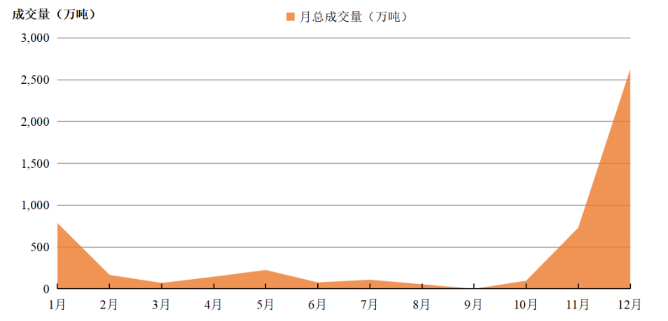 2022年全国碳市场的交易主要集中在年初和年末,1-2月、11-12月成交量分别占全年总成交量的19%、66%。