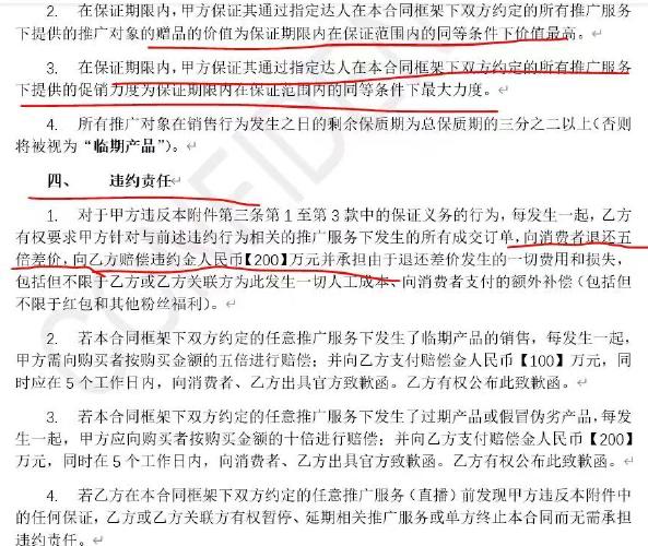 但10月26日界面新闻的一则报道显示,李佳琦所在的“美ONE”公司与品牌方之间签署的合同条款规定,在固定期限内,若其它渠道的促销力度大于李佳琦直播间,品牌需向消费者退换五倍差价,并向美ONE赔偿违约金200万元,同时承担由于退还差价发生的一切费用和损失。