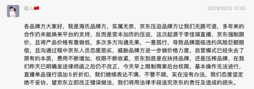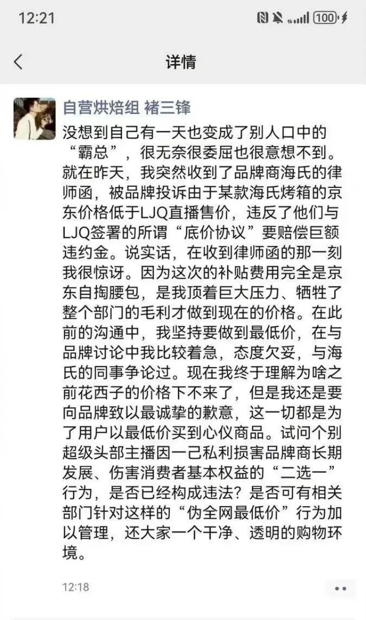 海氏品牌方发出声明的次日,京东一位采销人员同样情绪饱满地发了一条朋友圈,表示无奈的同时,也扯下了品牌方和头部主播之间关于“底价协议”的“遮羞布”,并表示此次补贴费用完全由京东自掏腰包,其所在部门牺牲了毛利才做到如此低价,但也承认了与海氏品牌方之间有过争论,态度欠妥。
