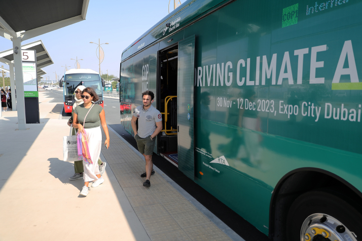People get off a Chinese-manufactured electric bus at the shuttle bus stop for the 28th session of the Conference of the Parties (COP28) to the United Nations Framework Convention on Climate Change in Dubai, the United Arab Emirates, on December 3 (XINHUA)