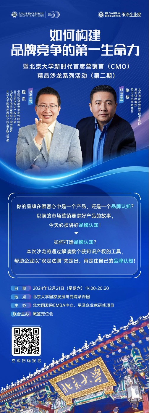 主讲嘉宾:程凯(框架式极简竞争定位原创者,三项定位知识产权原创者,北京大学国家发展研究院EMBA职业导师),张黎(北大国发院营销管理学教授,发树讲席教授,DPS项目学术主任)