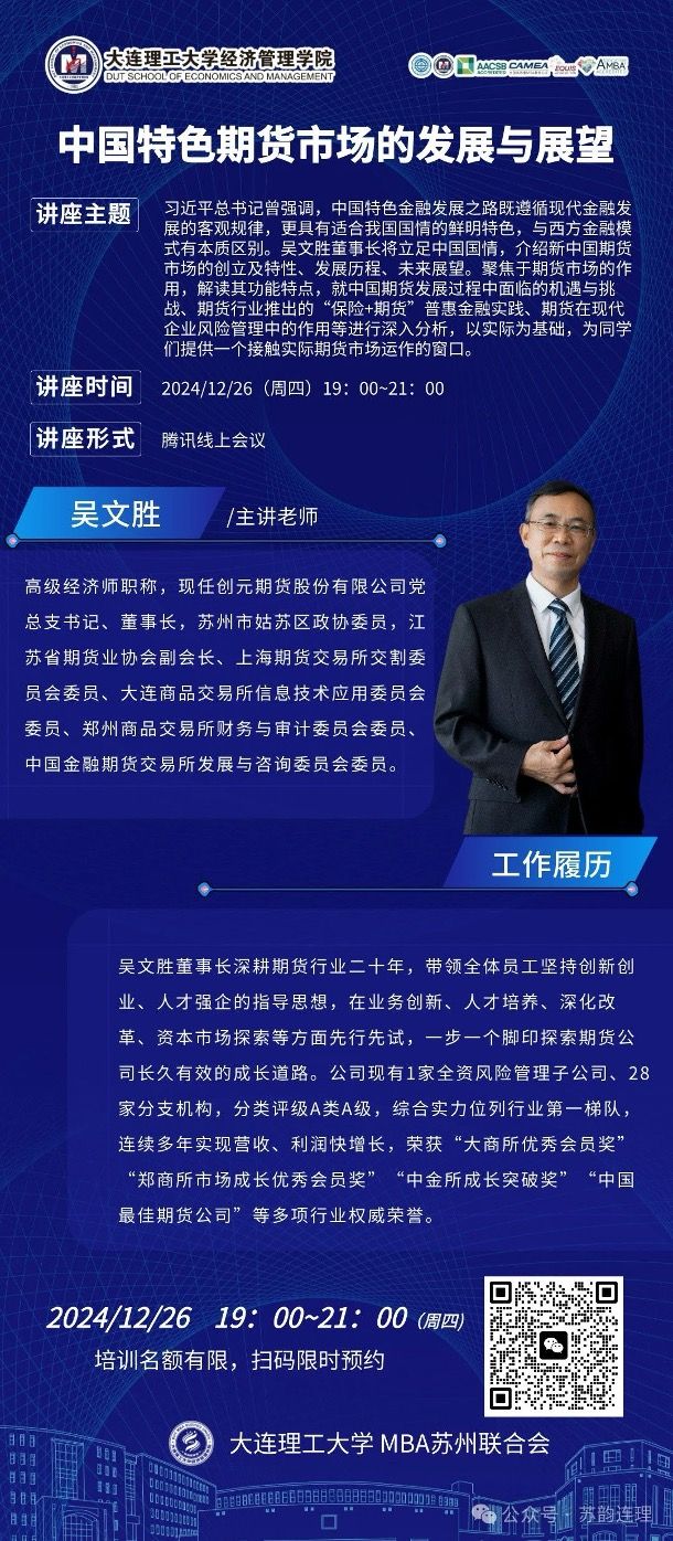 主讲人:吴文胜(高级经济师职称,现任创元期货股份有限公司党总支书记、董事长,苏州市姑苏区政协委员)