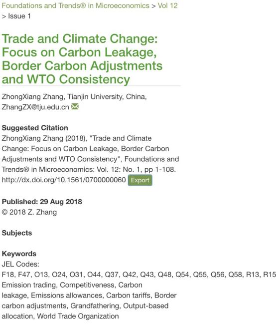 ZhongXiang Zhang (2018), Trade and Climate Change: Focus on Carbon Leakage, Border Carbon Adjustments and WTO Consistency,Foundations and Trends® in Microeconomics,Vol. 12,No. 1, pp 1-108,http://dx.doi.org/10.1561/0700000060.