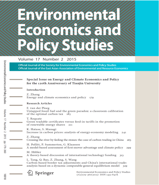 包括为美国经济学会EconLit收录、德国Springer 出版社出版的国际期刊Environmental Economics and Policy Studies主编的以《能源与气候变化经济学和政策》为主题的特刊号(第17卷,2015年),该特刊定名为天津大学120周年校庆纪念特刊号,收录来自世界最顶尖宏观经济学家、牛津大学经济系Rick van der Ploeg教授,Journal of Environmental Economics and Management主编、德国基尔大学经济系Till Requate教授,欧盟委员会世界顶级政策研究学者Ger Klaassen博士等单位的世界一流学者的最新研究成果。