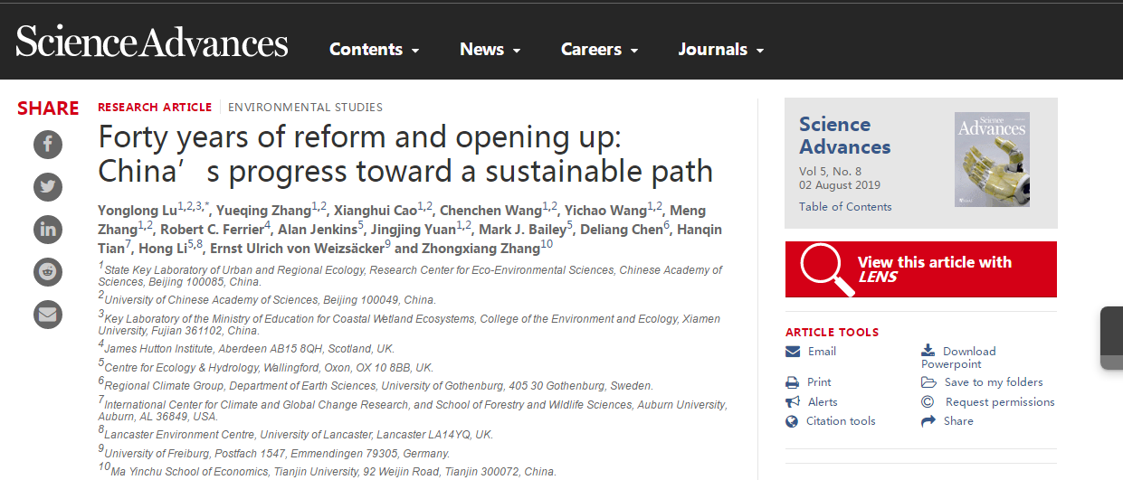 Yonglong Lu*, Yueqing Zhang, Xianghui Cao, Chenchen Wang, Yichao Wang, Meng Zhang, Robert C. Ferrier, Alan Jenkins, Jingjing Yuan, Mark J Bailey, Deliang Chen, Hanqin Tian, Hong Li, Ernst Ulrich von Weizsacker, Zhongxiang Zhang. Forty years of reform and opening up: China’s progress toward a sustainable path. Science Advances, 2019, Vol. 5, No. 8, eaau9413,DOI: 10.1126/sciadv.aau9413.