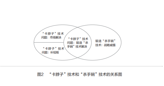 关于“卡脖子”技术问题和“杀手锏”技术问题之间的关系,如图2所示。“卡脖子”技术问题与“杀手锏”技术问题之间既有联系又有区别,二者有共同重叠的区域,也同时具有各自的特色。一方面,并不是所有的“卡脖子”技术问题都需要通过锻造“杀手锏”技术才能解决,有些问题可以通过发挥市场主体的力量加以解决,而有些问题则需要通过补短板才能解决;另一方面,并不是所有“杀手锏”技术的锻造,都以解决“卡脖子”技术问题为目标。“杀手锏”技术的锻造既要考虑解决实际问题,帮助突破部分“卡脖子”技术问题,又要从战略高度引领整体发展,形成具有战略威慑性质的技术储备,为中国的产业安全提供保障,这也是锻造“杀手锏”技术的应有之义。在锻造“杀手锏”技术与突破“卡脖子”技术方面,应当注意以下问题: