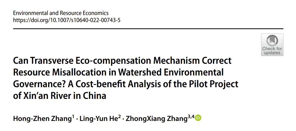 河北大学管理学院讲师张洪振博士、暨南大学经济学院何凌云教授与天津大学马寅初经济学院创院院长、卓越教授,国家能源、环境和产业经济研究院院长张中祥合作的文章“Can Transverse Eco-compensation Mechanism Correct Resource Misallocation in Watershed Environmental Governance? ACost-benefit Analysis of the Pilot Project of Xin’an River in China”在Springer出版社出版的期刊Environmental and Resource Economics在线发表。