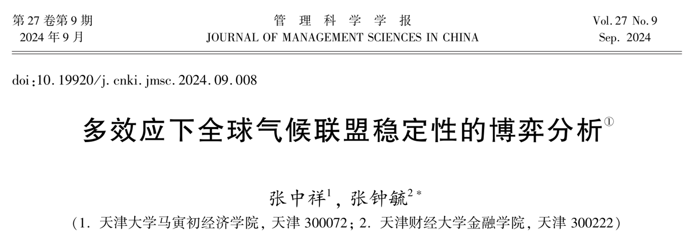 天津大学卓越教授、马寅初经济学院创院院长,国家能源、环境和产业经济研究院院长张中祥与其指导毕业的博士生、现任天津财经大学金融学院讲师张钟毓博士合作的论文《多效应下全球气候联盟稳定性的博弈分析》在管理学领域中文权威期刊《管理科学学报》正式发表,刊登在2024年9月出版的该刊第27卷、第9期,124-144页。该文于2023年1月20日被录用。